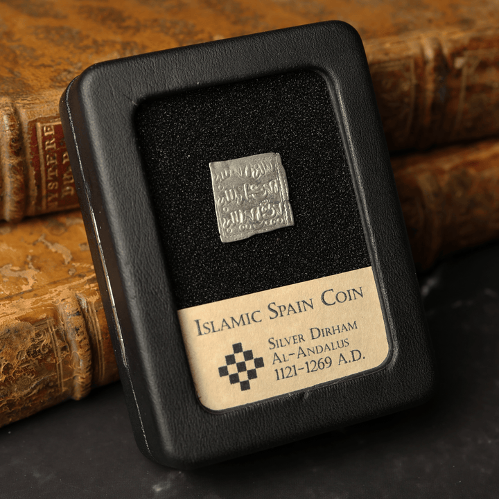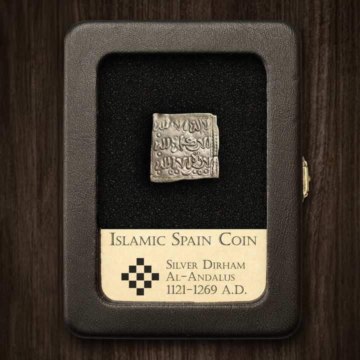 The square silver dirham from Al-Andalus is a striking example of the rich cultural and artistic fusion that defined Islamic Spain. These coins stand out immediately due to their unusual square shape—an aesthetic choice that set them apart from the more common round coins of both Islamic and Christian mints. They’re inscribed with elegant Kufic script, bearing the iconic phrase of the 'shahada' - the Islamic profession of faith - along with the name of the issuing authority and mint location, usually cities like Córdoba, Almería, or Seville. Rather than featuring portraits, which Islamic tradition generally avoided, the beauty of these coins lies in their geometry, symmetry, and calligraphy, making each one a small masterpiece of medieval design.