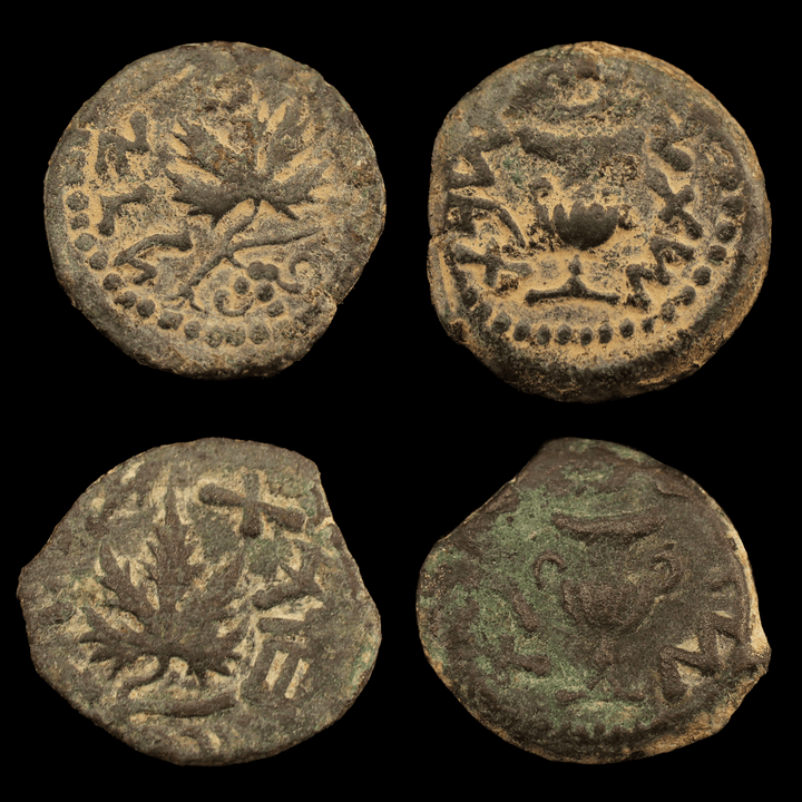 Theses coins, minted between 66 and 70 A.D. during the First Jewish Revolt against Rome were the first truly independent Jewish coinage in centuries. Struck in bronze in Jerusalem, they symbolized defiance against imperial control and celebrated the reestablishment of Jewish sovereignty. The designs were simple yet powerful: one of the most recognizable types features a chalice or ceremonial pot on one side, and on the other, a branch with three pomegranate buds or leaves, representing fertility and divine favor. The inscriptions were written in ancient Hebrew script, further asserting national and religious identity.