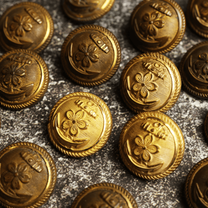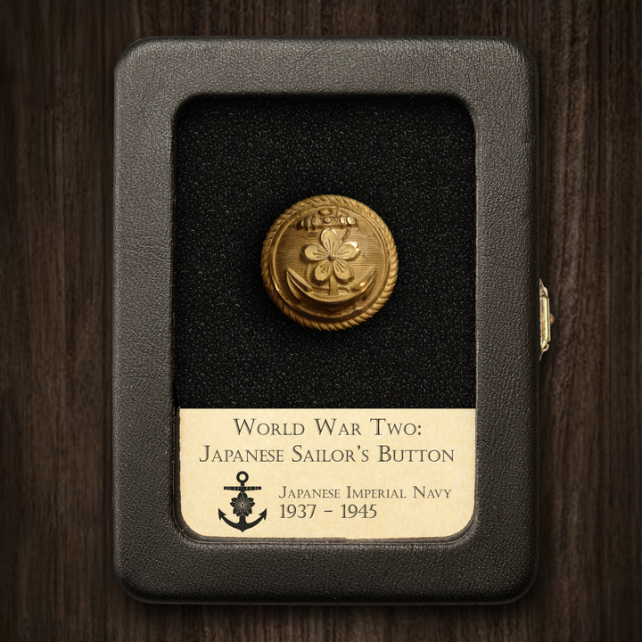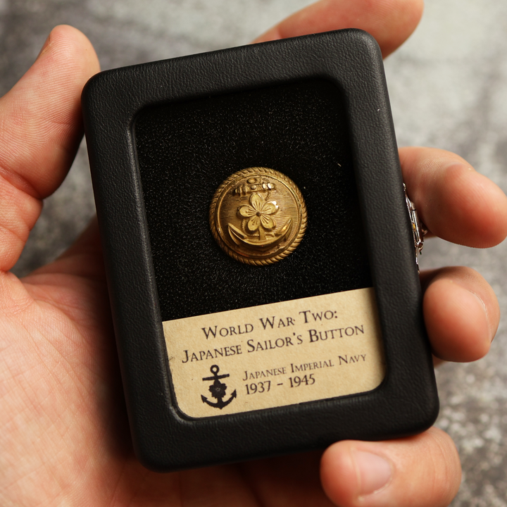 The buttons worn by sailors of the Imperial Japanese Navy during World War II are small yet potent symbols of a once-formidable maritime power. Made of brass, these buttons featured a crisp, stylized anchor adorned with the Japanese Sherry Blossom, known as the 'Sakura'. They were worn on dark navy-blue uniforms, arranged in formal rows on double-breasted jackets that reflected both Western military fashion and the Imperial Navy’s emphasis on order and ceremony. Though small in size, the buttons were immaculately crafted, often retaining their detail and sheen even decades after the war.