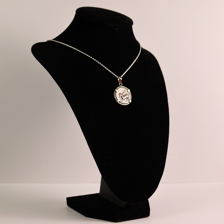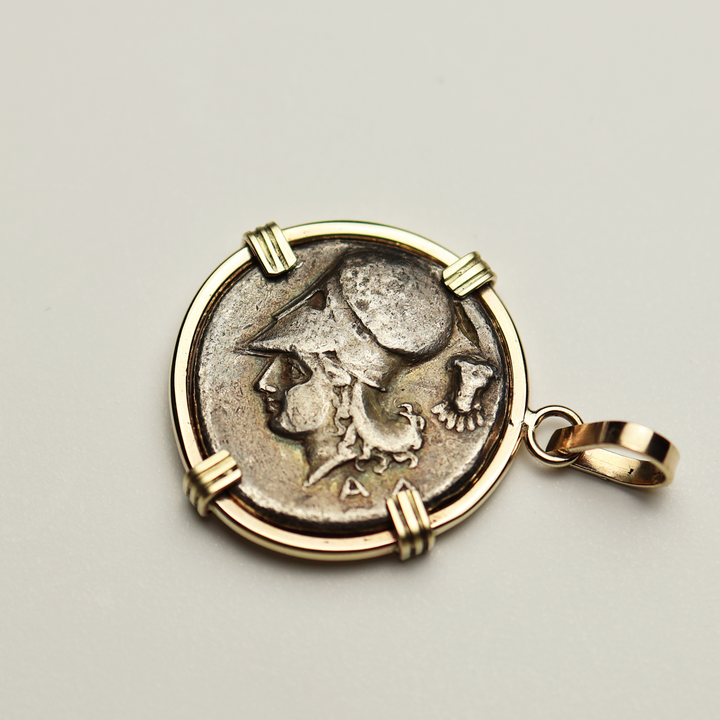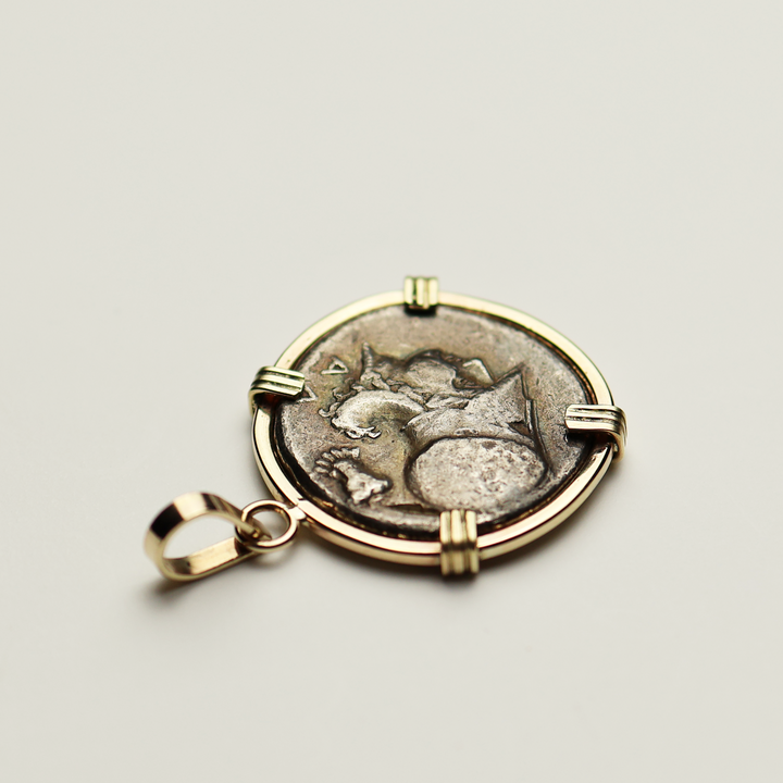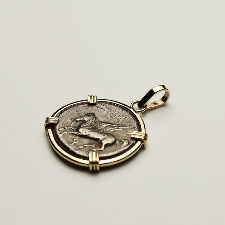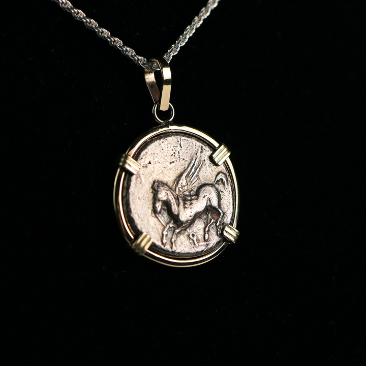 This item is an authentic Corinthian Silver Stater, placed in a handmade bezel of 14 karat gold. There is only 1 of this item; you will receive the exact pendant shown in the photos.
