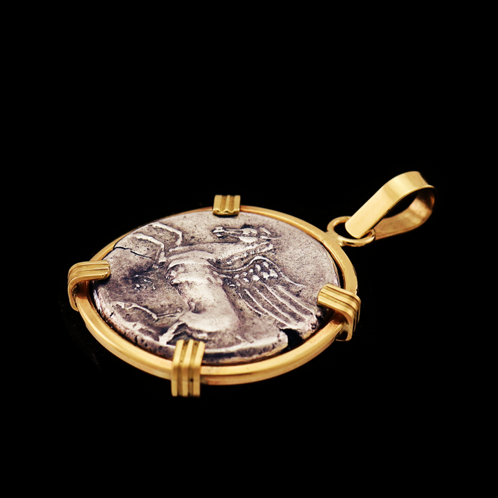 This item is an authentic Greek silver stater, placed in a handmade bezel of 14 karat gold. There is only 1 of this item; you will receive the exact pendant shown in the photos.