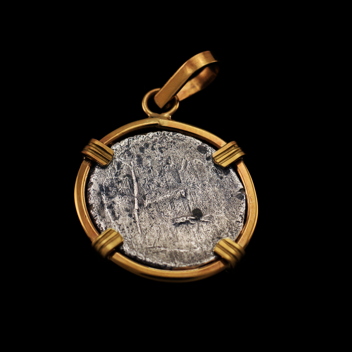 This item is an authentic Roman silver denarius coin, placed in a handmade bezel of 14 karat gold. There is only 1 of this item; you will receive the exact pendant shown in the photos.