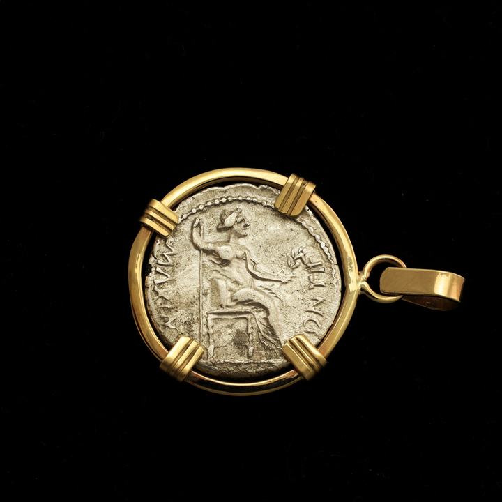 This item is an authentic Roman silver denarius coin, placed in a handmade bezel of 14 karat gold. There is only 1 of this item; you will receive the exact pendant shown in the photos.