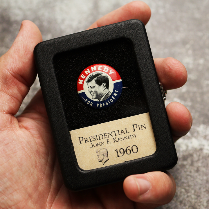 Original J.F.K campaign pins from 1960. This original presidential campaign artifact is a memento to one of America’s most memorable presidents whose legacy has left an indelible mark on American and World history alike.