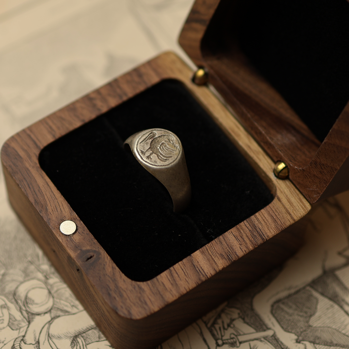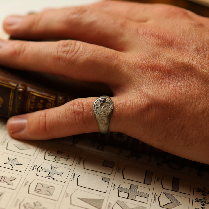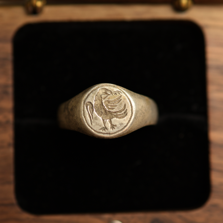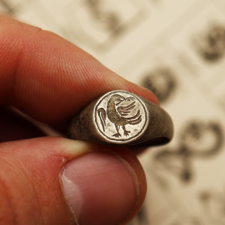 Dated to the 15th-16th century, this silver ring features a flat discoid bezel framed by an incised border. At its center is a stylized bird, rendered in profile with wings raised and head turned backward—a posture known as regardant. This pose, though uncommon in later heraldry, often conveyed alertness, vigilance, or introspection in earlier iconography.