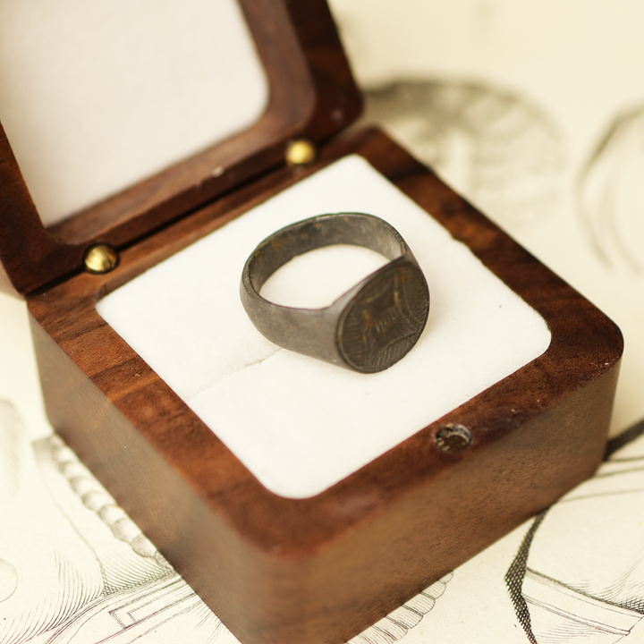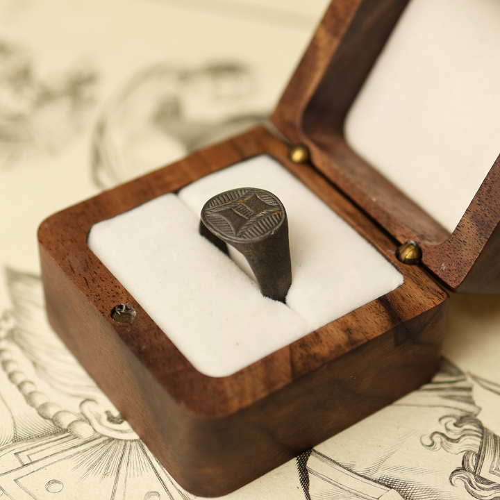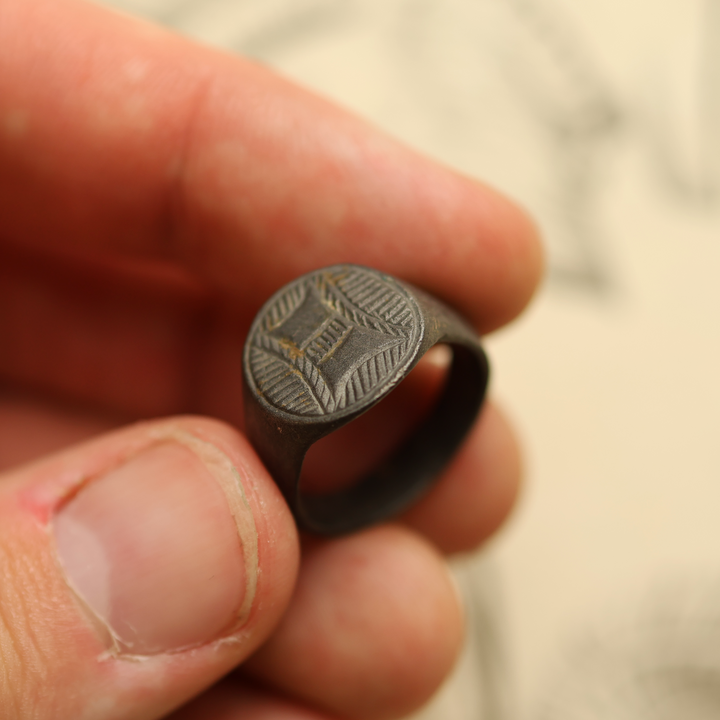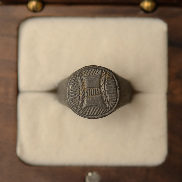 The ring’s shank is thick and solid, with a smoothly tapering profile—typical of utilitarian rings that served both decorative and practical functions. Roman rings of this type were often used as personal seals, pressed into wax or clay to authenticate correspondence or goods. While the meaning of the central motif remains uncertain, its stylized form suggests a concern with order, proportion, and legibility—key visual values in Roman administrative and commercial contexts.