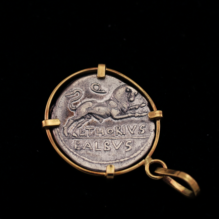 Silver denarii bearing the name of Lucius Thorius Balbus were struck around 105 B.C., during the later years of the Roman Republic. The obverse shows the head of Juno Sospita facing right, identified by her unique goat-skin headdress, the horns visible above her brow. Juno Sospita was the guardian deity of Lanuvium, the ancestral home of the Thorius family, and her image linked the coin’s design to the moneyer’s heritage and local cult traditions. The fine engraving captures her as both fierce and divine, a symbol of protection and fertility under whose favor the state and its people thrived.