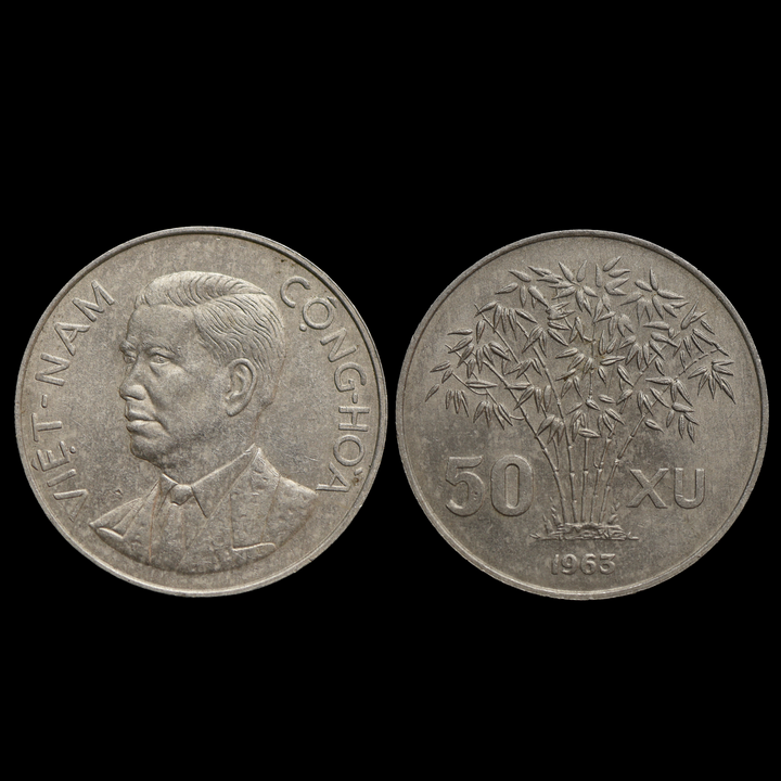 On the obverse of the 50 Xu coin, Ngo Dinh Diem , then President of the Republic of Vietnam/South Vietnam (1955-1963), is featured facing left. The reverse instead bears the denomination "50 Xu" along with a decorative bamboo motif. The xu itself was a fractional unit of the đồng, with 100 xu equaling 1 đồng. While the 50 Xu coin was a practical piece of currency, its low value meant it was mainly used for minor, everyday purchases .