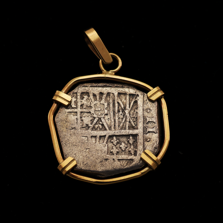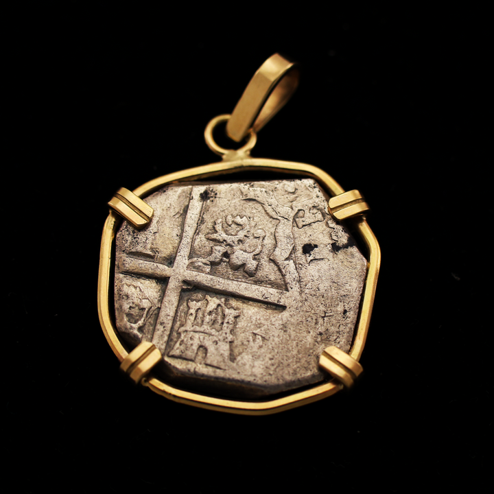 This item is an authentic Spanish Colonial Silver 2 Reales coin, placed in a handmade bezel of 14 karat gold. There is only 1 of this item; you will receive the exact pendant shown in the photos.